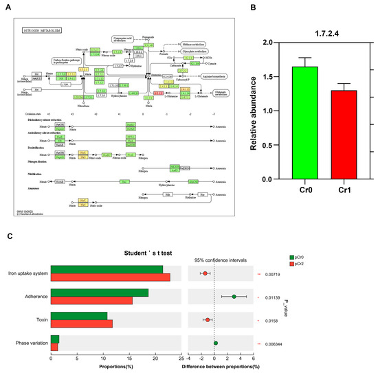 Diagram showing the impact of the heavy metal chromium on microbial nitrogen metabolism pathways and virulence factors. (A) KEGG pathway diagram of nitrogen metabolism. (B) Variations in the concentration of N2O reductase involved in nitrogen metabolism following exposure to heavy metal chromium. (C) Impact of chromium treatment on virulence factors. The t-test was employed, with * indicating p < 0.05 and ** indicating p < 0.01. 1.7.2.4 represents N2O reductase in the nitrogen metabolism pathway.