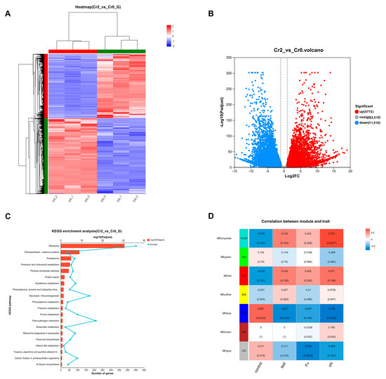 Transcriptional sequencing for the identification of chromium resistance genes in sunflowers. (A) Heat map illustrating differentially expressed genes in sunflower subjected to various chromium treatments. (B) Volcano plot depicting differentially expressed genes in sunflowers with distinct chromium treatments. (C) Differential KEGG pathway analysis of sunflowers under varying chromium treatments. (D) Correlation module between WGCNA and chlorophyll fluorescence parameters.