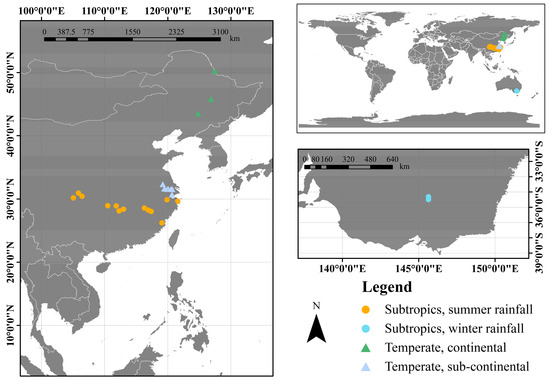 In addition, we recorded experiment positions (including longitude and latitude) (Figure 1) and soil parameters (initial soil pH, SOC, total N (TN), C/N, NH4+-N, NO3−-N, NO2−-N) and experiment details (management type, experiment duration, and N application rate). The mean annual temperature (MAT), mean annual precipitation (MAP), and aridity index (AI) were also extracted, or when not reported, extracted from the WorldClim database using latitude and longitude information. Data were also grouped into two climate zones by study site MAT, cool (temperate and Mediterranean climates), and warm (subtropical and tropical climates) [29]. Data were also grouped by initial SOC content into poor (≤6 g C kg−1), low (6–12 g C kg−1), moderate (12–20 g C kg−1), and rich (>20 g C kg−1) categories, and by the initial soil pH into acidic (≤6), neutral (6–8), or alkaline (>8) groups [30]. The experiment duration was classified by short term (≤3 years), medium term (3–10 years), or long term (>10 years) [30]. The N application rate was grouped by poor (≤10 g N m−2), low (10–20 g N m−2), moderate (20–30 g N m−2), and high (>30 g N m−2) categories. Other soil physical characteristics were also collected in our study, i.e., soil texture, soil type, and soil sample depth (Supplementary Dataset S1). These properties were not analyzed in the subgroup analyses without enough data. Finally, 17 peer-reviewed papers matched these criteria (Supplementary S1). Data presented only in figures within the studies were extracted by WebPlotDigitizer® [31]. This research collected 100 paired observations that researched the influences of cropland management on anammox rate and hzs gene abundance for further meta-analysis (Supplementary Dataset S1).