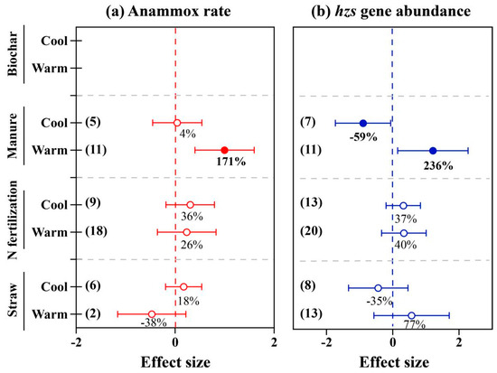 Weighted summary effect sizes (ln RR) on anammox rate (a) and hzs gene abundance (b). Error bars correspond to 95% CI. The numbers below the bar refer to the effect size (%) of different cropland managements. Bold numbers represent the significant effect, and the regular numbers represent the non-significant effect. Biochar: biochar addition; manure: manure amendment; straw: straw amendment. The number in parentheses represents the number of observations. The closed and open symbols indicate significant and non-significant effects, respectively. The red dots represent the anammox rate and the blue dots represent hzs gene abundance.
