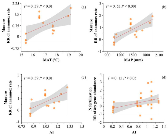 Relations between the MAT and RR of the anammox rate (a), the MAP and RR of the anammox rate (b), and the AI and RR of the anammox rate (c) of manure application. Relations between the AI and RR of hzs gene abundance under N fertilization (d). The orange circles and squares represent managements of manure amendment and N fertilization with positive relations, respectively. Red lines with gray shadings are slopes with ±95% confidence intervals.