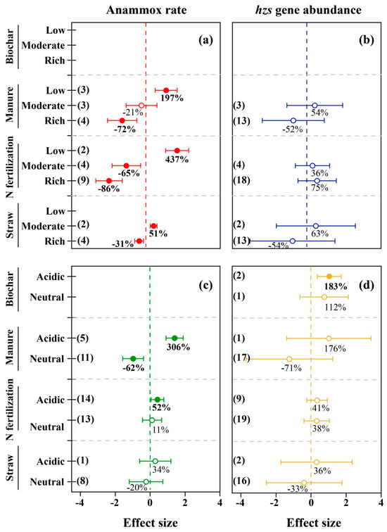 Weighted summary effect sizes (ln RR) on anammox rate and hzs gene abundance related to soil performances, including initial SOC level (a,b) and pH (c,d). Error bars correspond to 95% CI. The numbers below the bar refer to the effect size (%) of different cropland managements. Bold numbers represent the significant effect, and the regular numbers represent the non-significant effect. Biochar: biochar addition; manure: manure amendment; straw: straw amendment. The grey dashed lines were used to separate different cropland managements. The number in parentheses represents the number of observations. The closed and open symbols indicate significant and non-significant effects, respectively. The red, green dots represent the anammox rate and the blue, yellow dots represent hzs gene abundance.