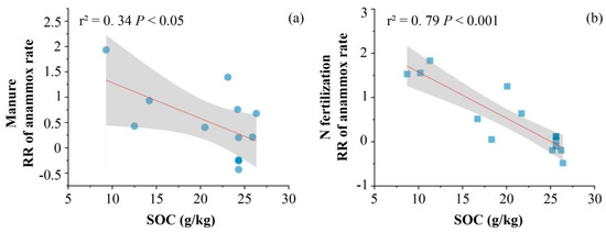 Relation between SOC and RR of anammox rate under manure amendment (a) and N fertilization (b). The blue circles and squares represent managements of manure amendment and N fertilization with negative relations, respectively. Red lines with gray shadings are slopes with ±95% confidence intervals.