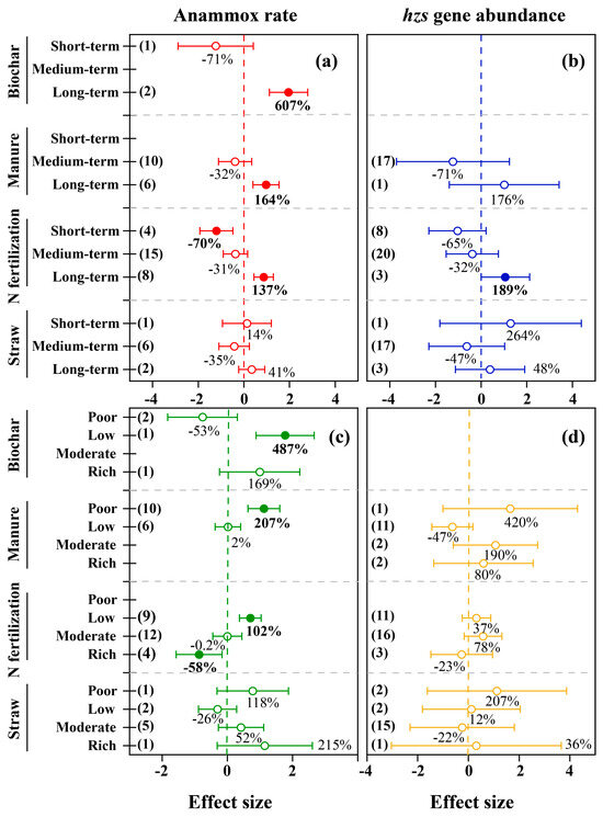 Weighted summary effect sizes (ln RR) on anammox rate and hzs gene abundance depending on experiment duration (a,b) and N application rate (c,d). Error bars correspond to 95% CI. The numbers below the bar refer to the effect size (%) of different cropland managements. Bold numbers represent the significant effect, and the regular numbers represent the non-significant effect. Biochar: biochar addition; manure: manure amendment; straw: straw amendment. The grey dashed lines were used to separate different cropland managements. The number in parentheses represents the number of observations. The closed and open symbols indicate significant and non-significant effects, respectively. The red, green dots represent the anammox rate and the blue, yellow dots represent hzs gene abundance.