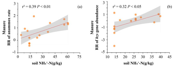 The effects on the anammox rate and hzs gene abundance were also dependent on the N application rate (Figure 7c,d). Biochar addition, manure application, and N fertilization all significantly increased the anammox rate when the N application rate was poor or low (<20 g N m−2) (p < 0.001, Figure 7c). N fertilization decreased the anammox rate when the N application rate was moderate or high (>20 g N m−2) (p < 0.05, Figure 7c). The N application can change soil available nitrogen, especially NH4+-N. Both of the RRs of the anammox rate and hzs gene abundance were significantly positively correlated with soil NH4+-N only under manure amendment (p < 0.01, 0.05, Figure 8a,b).