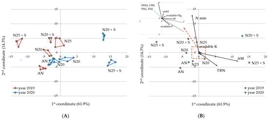 The fertilization of triticale with nitrogen based on foliar fertilizers also had a positive effect on the activity of phosphatases and dehydrogenase (Figure 4, Figure 6 and Figure 7), which are considered indicators of the mineralization potential of organic matter in soil [,]. This trend, similar to the activity of urease and the tested soil microorganisms, was particularly noticeable in the variants enriched with sulfur in the second year of the study. Research by Niewiadomska et al. [] showed that the foliar fertilization of white lupine modified the level of enzymatic activity of the soil. The authors observed a decrease in the catalytic activity of phosphatase only at the time of activation of the phosphorus compounds unavailable to plants. Also, Sun et al. [] reported that the synthesis of phosphatases by microorganisms and plant roots was induced in the absence of plant-available phosphorus in a soil solution. Therefore, an increase in the content of this macroelement contributes to a decrease in their activity in the soil. Our own principal components analysis did not confirm the precise direction of the relationship between the level of activity of the tested phosphatases and the content of available phosphorus in the soil and depended mainly on the type of experimental variant. Nevertheless, the availability of absorbable phosphorus, potassium, calcium, and magnesium modified the biochemical activity of the soil to the greatest extent (Figure 10). No significant relationship was observed between the triticale yield and the activity levels of the enzymes discussed.