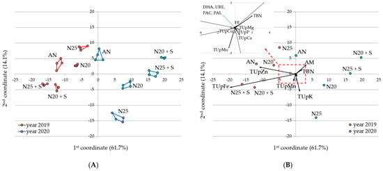Results of the canonical variate analysis, showing the relationship between the experimental variants and the grain yield, microbiological, and enzymatic parameters and nutrient uptake. (A) Results based on transformation by linear combination; (B) results based on singular-value decomposition; AN—control (fertilization with ammonium nitrate); N20—nitrogen dose reduced by 20% compared to the control variant; N25—nitrogen dose reduced by 25% compared to the control variant; N20 + S—nitrogen dose reduced by 20% compared to the control variant, and fertilizer enriched with sulfur; N25 + S—nitrogen dose reduced by 25% compared to the control variant, and fertilizer enriched with sulfur; URE—urease activity; PAC—acid phosphatase; PAL—alkaline phosphatase; DHA—dehydrogenase; TBN—total bacteria number; FF—filamentous fungi; AM—ammonifying microorganisms.