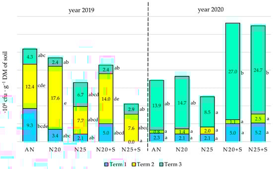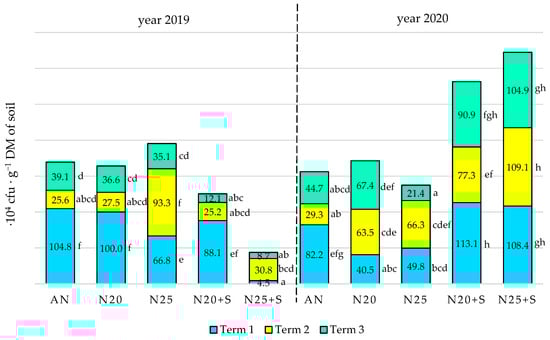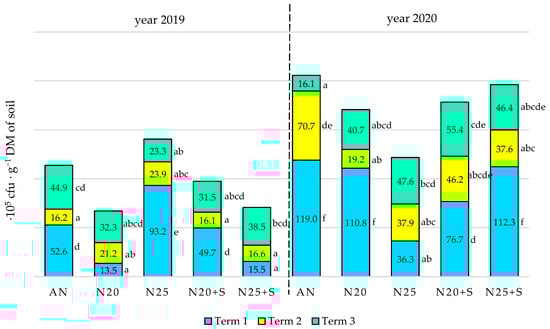 Changes in the total bacteria number in the soil. Different lowercase letters denote significant differences in each column (p < 0.05); AN—control (fertilization with ammonium nitrate); N20—nitrogen dose reduced by 20% compared to the control variant; N25—nitrogen dose reduced by 25% compared to the control variant; N20 + S—nitrogen dose reduced by 20% compared to the control variant, and fertilizer enriched with sulfur; N25 + S—nitrogen dose reduced by 25% compared to the control variant, and fertilizer enriched with sulfur.