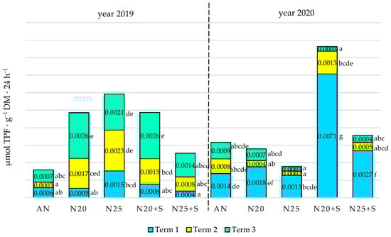 Changes in the dehydrogenase activity in the soil. Different lowercase letters denote significant differences in each column (p < 0.05); AN—control (fertilization with ammonium nitrate); N20—nitrogen dose reduced by 20% compared to the control variant; N25—nitrogen dose reduced by 25% compared to the control variant; N20 + S—nitrogen dose reduced by 20% compared to the control variant, and fertilizer enriched with sulfur; N25 + S—nitrogen dose reduced by 25% compared to the control variant, and fertilizer enriched with sulfur.