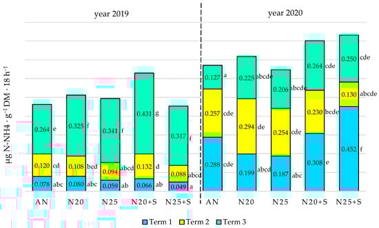 Changes in the number of ammonifying microorganisms in the soil. Different lowercase letters denote significant differences in each column (p < 0.05); AN—control (fertilization with ammonium nitrate); N20—nitrogen dose reduced by 20% compared to the control variant; N25—nitrogen dose reduced by 25% compared to the control variant; N20 + S—nitrogen dose reduced by 20% compared to the control variant, and fertilizer enriched with sulfur; N25 + S—nitrogen dose reduced by 25% compared to the control variant, and fertilizer enriched with sulfur.