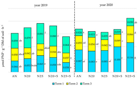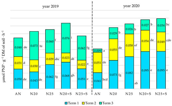 Changes in the alkaline phosphomonoesterase activity in the soil. Different lowercase letters denote significant differences in each column (p < 0.05); AN—control (fertilization with ammonium nitrate); N20—nitrogen dose reduced by 20% compared to the control variant; N25—nitrogen dose reduced by 25% compared to the control variant; N20 + S—nitrogen dose reduced by 20% compared to the control variant, and fertilizer enriched with sulfur; N25 + S—nitrogen dose reduced by 25% compared to the control variant, and fertilizer enriched with sulfur.