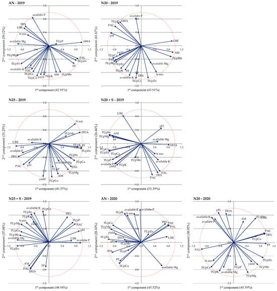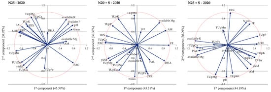 Coefficients of correlation between microbiological, enzymatic, chemical parameters and nutrient uptake in the space of the first two principal components; AN—control (fertilization with ammonium nitrate); N20—nitrogen dose reduced by 20% compared to the control variant; N25—nitrogen dose reduced by 25% compared to the control variant; N20 + S—nitrogen dose reduced by 20% compared to the control variant, and fertilizer enriched with sulfur; N25 + S—nitrogen dose reduced by 25% compared to the control variant, and fertilizer enriched with sulfur; URE—urease activity; PAC—acid phosphatase; PAL—alkaline phosphatase; DHA—dehydrogenase; TBN—total bacteria number; FF—filamentous fungi; AM—ammonifying microorganisms.