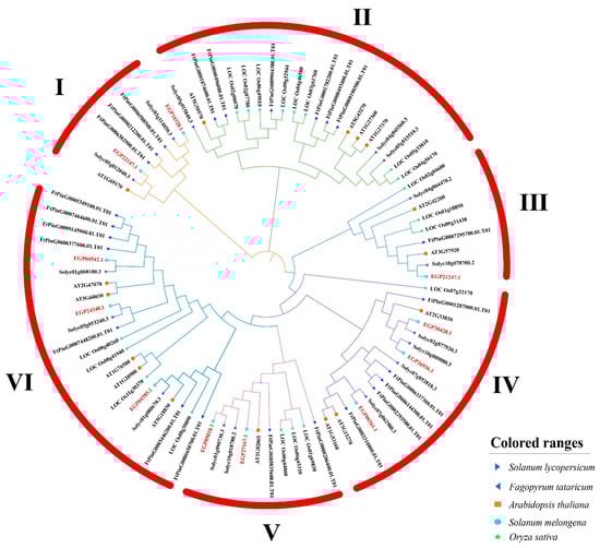 Phylogenetic relationships of the SPL proteins from five different plant species. The font in red represents the SPLs are from Solanum melongena, while the font in black indicates SPLs are from other four species (Solanum lycopersicum, Fagopyrum tataricum, Arabidopsis thaliana, and Oryza sativa); Colorful lines are used to distinguish different groups: the yellow line represents the group I, the green line represents the group II, the dark blue line represents the group III, the purple line represents the group IV, the fuchsia line represents the group V, and the blue line represents the group VI.