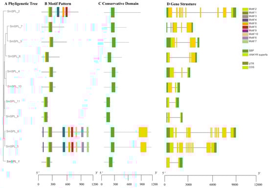 The systematic evolutionary relationships, conserved protein structural domains, gene structure, and intron/exon structure of the SmSPL genes. (A) A phylogenetic tree of the SmSPL proteins. (B) Conserved motif of SmSPL proteins. (C) Conservation domain analysis. (D) Intron/exon structure of SmSPL genes.