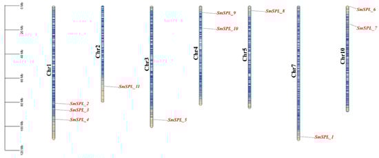 Based on the eggplant genome database, 11 SmSPL genes were randomly distributed across seven eggplant chromosomes (Chr) (Figure 4). There was only one SmSPL gene on Chr2, Chr3, Chr5, and Chr7, three genes on Chr1 (SmSPL_2, SmSPL_3, SmSPL_4), and two genes each on Chr4 and Chr10.