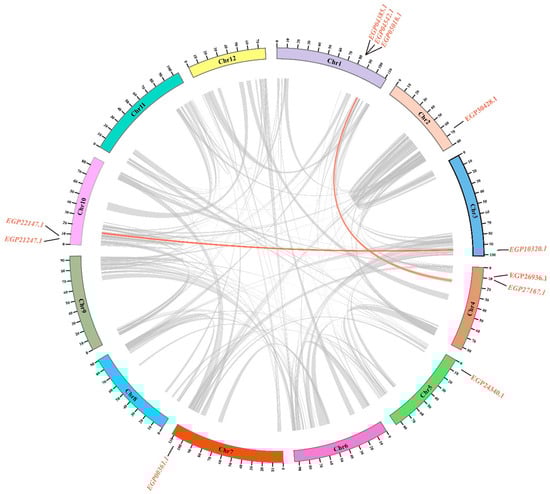 Chromosome interrelationship diagram of SmSPL genes. Red lines represented the segmental duplicated SmSPL genes. The gray line represented all collinearity relationships within the genomes of eggplant and other species.