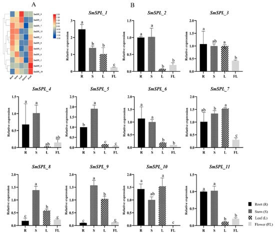 The tissue-specific expression of 11 SmSPL genes and the expression patterns of these genes of eggplant. (A) Heatmap illustrating the expression patterns of 11 SPL genes in eggplant. High expression is shown in red; low expression is shown in blue. (B) The expression levels of 11 SmSPL genes in different tissues of eggplant were analyzed using analysis of variance (ANOVA), and the lowercase letters above the columns represent significant differences (p ≤ 0.05).