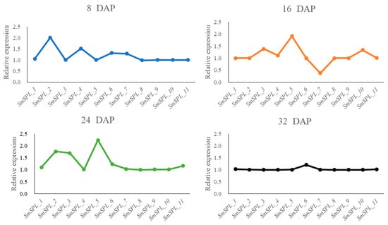 Expression of SmSPL genes in different stages of fruit development: 8, 16, 24, and 32 days after pollination. The four stages are defined as follows: 8 DAP (young fruit stage), 16 DAP (expansion stage), 24 DAP (commercial fruit stage), and 32 DAP (discoloration stage).