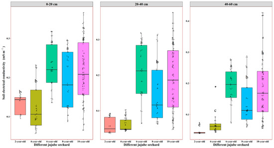 Effect of jujube orchard with different years of cultivation on soil electrical conductivity. Different lowercase letters in the figure indicate a significant difference (p < 0.05).