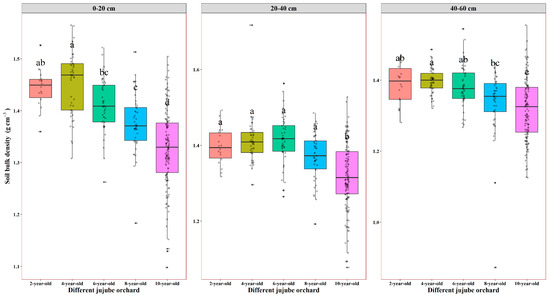 Effect of jujube orchard with different years of cultivation on soil bulk density. Different lowercase letters in the figure indicate a significant difference (p < 0.05).