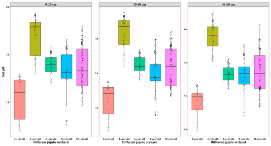 Effect of jujube orchard with different years of cultivation on soil pH. Different lowercase letters in the figure indicate a significant difference (p < 0.05).