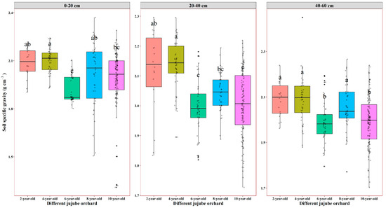 Effect of jujube orchard with different years of cultivation on soil specific gravity of soil. Different lowercase letters in the figure indicate a significant difference (p < 0.05).