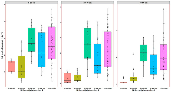 Effect of jujube orchard with different years of cultivation on soil total salt content. Different lowercase letters in the figure indicate a significant difference (p < 0.05).