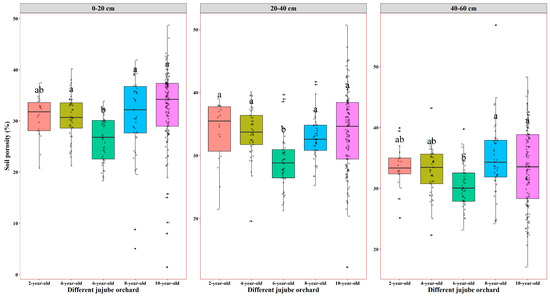 Effect of jujube orchard with different years of cultivation on soil total porosity. Different lowercase letters in the figure indicate a significant difference (p < 0.05).
