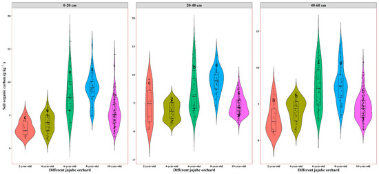 With the increase in planting years, soil organic carbon in different soil layers increased first and then decreased (Figure 9). The soil organic carbon content in different soil layers of 2-year-old jujube orchards was the lowest, and the soil organic carbon content in 0–20 cm, 20–40 cm, and 40–60 cm jujube orchards was the highest in 6–8 years, which was significantly higher than that in 2-year-old, 4-year-old, and 10-year jujube orchards (p < 0.05). The organic carbon content of the 0–20 cm soil layer of 6-year-old jujube orchards was significantly higher by 833.07%, 160.85%, 108.29%, and 46.93% than the soil organic carbon content of 2-year, 4-year, and 10-year jujube orchards, respectively (p < 0.05). The organic carbon content of the 0–20 cm soil layer of 8-year-old jujube orchards was significantly higher by 980.94%, 202.19%, 141.30%, and 70.21%, and that of the 20–40 cm jujube orchard was significantly higher by 72.50%, 78.81%, 150.11%, and 95.25%; in the 40–60 cm layer, it was higher by 90.41%, 167.60%, 84.52%, and 68.11%, respectively (p < 0.05).