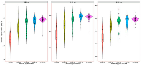 Effect of jujube orchard with different years of cultivation on labile soil organic carbon. Different lowercase letters in the figure indicate a significant difference (p < 0.05).