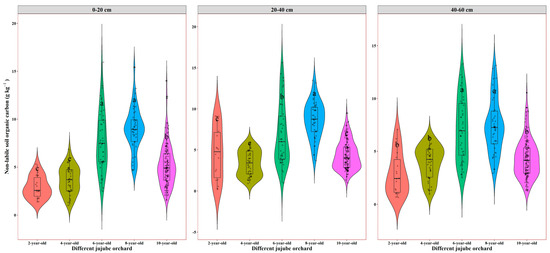Effect of jujube orchard with different years of cultivation on non-labile soil organic carbon. Different lowercase letters in the figure indicate a significant difference (p < 0.05).