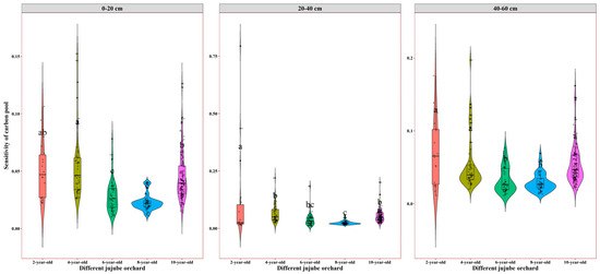 In different soil layers, the carbon pool activity of 8-year-old orchards was the lowest (Figure 12). In the 0–20 cm soil layer, the sensitivity of the carbon pool of 8-year-old orchards was 150.00%, 200.00%, and 100.00% lower than that of 2-year-old, 4-year-old, and 10-year-old orchards (p < 0.05). The sensitivity of the carbon pool of 6-year-old orchards was 66.67%, 100.00%, and 33.33% lower than that of 2-year-old, 4-year-old, and 10-year-old orchards (p < 0.05). The sensitivity of the carbon pool of 10-year-old orchards was significantly lower than that of 4-year-old orchards by 50.00% (p < 0.05). In the 20–40 cm soil layer, the sensitivity of the carbon pool of 2-year-old and 8-year-old orchards was significantly lower than that of 4-year-old orchards, and that of 6-year-old and 10-year-old orchards was significantly lower than that of 4-year-old orchards (p < 0.05). The sensitivity of the carbon pool of 6-year-old and 10-year-old orchards was 200.00%, 100.00%, and 150.00%, and that of 8-year-old orchards was significantly higher than that of 4-year-old, 6-year-old, and 10-year-old orchards by 200.00%, 100.00%, and 150.00%, respectively. (p < 0.05). In the 40–60 cm soil layer, the sensitivity of the carbon pool of 6-year-old and 8-year-old orchards was significantly lower than that of 2-year-old, 4-year-old, and 10-year-old orchards, and the sensitivity of the carbon pool of 6-year-old orchards was significantly lower than that of 2-year-old orchards (p < 0.05). The sensitivity of the carbon pool of 4-year-old and 10-year-old orchards was 66.67% and 66.67%, and that of 8-year-old orchards was significantly lower than that of 2-year-old, 4-year-old, and 10-year-old orchards by 133.33%, 66.67%, and 66.67% (p < 0.05).