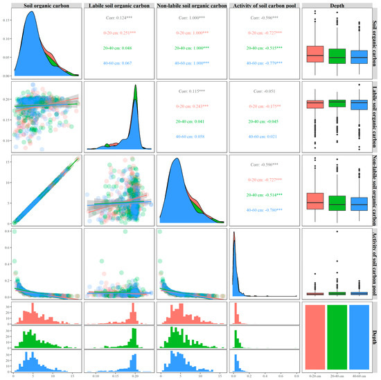 Soil organic carbon includes active soil organic carbon and inactive soil organic carbon, and all active soil organic carbon constitutes the active soil organic carbon pool. As can be seen from Figure 13, there is a significant positive correlation between soil organic carbon and active soil organic carbon, with a correlation degree of 0.124; there is a significant positive correlation between soil organic carbon and active soil organic carbon in the 0–20 cm layer with a correlation degree of 0.251; and there is no correlation between 20–40 cm and 40–60 cm layers. There was a significant positive correlation between soil organic carbon and inactive soil organic carbon, and the correlation was 1.000 for 0–20 cm, 20–40 cm, and 40–60 cm layers. Soil organic carbon and the active soil organic carbon pool were positively correlated, and the correlation was −0.596; for 0–20 cm, 20–40 cm, and 40–60 cm, the correlations were −0.727, −0.515, and −0.779, respectively. There is no correlation between active soil organic carbon and inactive soil organic carbon. The active soil organic carbon in the 0–20 cm layer was negatively correlated with the active soil organic carbon pool in the 0–20 cm layer, and the correlation was 0.175. There is a significant negative correlation between the inactive soil organic carbon and the active soil organic carbon pool, and the correlation between the inactive soil organic carbon and the active soil organic carbon pool was 0.596; for 0–20 cm, 20–40 cm, and 40–60 cm layers, the correlations were −0.727, −0.514, and −0.780, respectively.