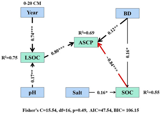Structural equation model of the 0–20 cm soil layer. SOC, ASCP, LSOC, and BD stand for soil organic carbon, active soil organic carbon pool, labile soil organic carbon, and bulk density. Asterisk (*) indicates that the standardized path coefficient reached a significance level, with *, **, and *** representing 0.05, 0.01, and 0.001 significance levels.