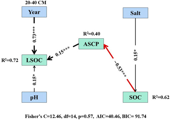Structural equation model of 20–40 cm soil layer. SOC, ASCP, and LSOC stand for soil organic carbon, active soil organic carbon pool, and labile soil organic carbon. Asterisk (*) indicates that the standardized path coefficient reached a significance level, with * and *** representing 0.05 and 0.001 significance levels.