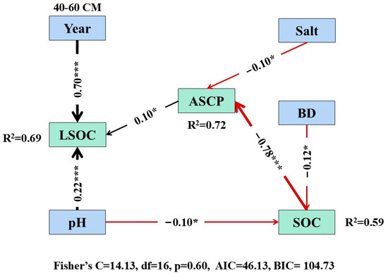 Structural equation model of 20–40 cm soil layer. SOC, ASCP, LSOC, and BD stand for soil organic carbon, active soil organic carbon pool, labile soil organic carbon, and bulk density. Asterisk (*) indicates that the standardized path coefficient reached a significance level, with * and *** representing 0.05 and 0.001 significance levels.