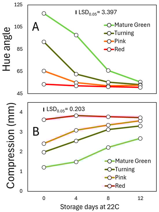 Color (h°) (A) and firmness (compression) (B) of tomato fruit that were harvested at four ripening stages and stored at shelf-life conditions for up to 12 days. Each value in each ripening stage and storage day represents mean of 80 fruit. Vertical bar represents least significant difference (LSD) at p < 0.05.