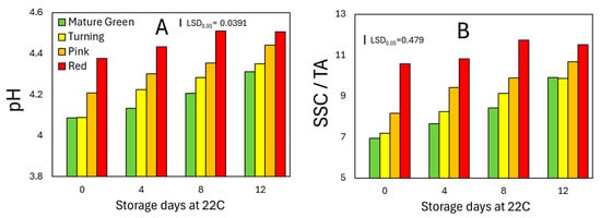 The pH (A) and the ratio of soluble solids content to titratable acidity (SSC/TA) (B) of tomato fruit that were harvested at four ripening stages and stored at shelf-life conditions for up to 12 days. Each column represents the mean of the four replications with five fruit in each replication within each ripening stage and storage day. The vertical bar represents the least significant difference (LSD) at p < 0.05.
