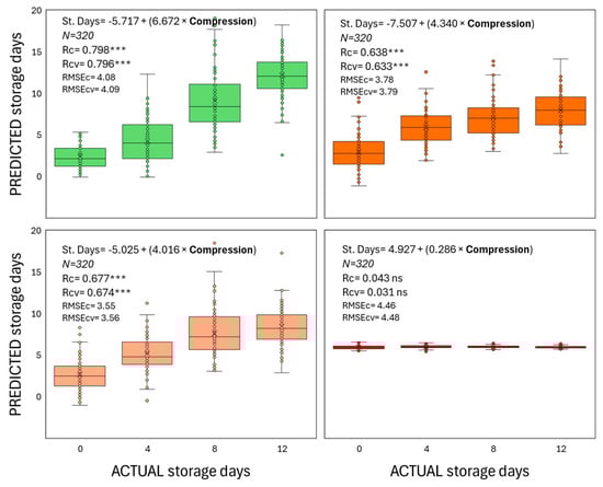 The predicted storage duration in relation to the actual one of the tomato fruits that were harvested at four ripening stages and stored at shelf-life conditions for up to 12 days, based on firmness (compression). Each box shows the interquartile range of the predicted data based on the liner regression of compression versus storage period. The vertical line that splits the box in half is the median, which shows where 50% of the data falls and the single points on the plot indicate outliers. Each box shows the results from the data captured on 80 fruits within each ripening stage and storage day. The equation represents a linear regression between the predicted and actual storage period, and the Rcv is the regression coefficient of the cross validated data based on the random subsets algorithm. ‘***’ represents the significance of the regression analysis (p < 0.001), whereas ‘ns’ implies no significant regression between compression and shelf-life period.