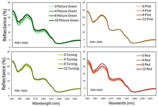 The spectral reflectance that was measured with a portable spectroradiometer (PSR+ 3500) in the region 350–2500 nm on tomato fruits that were harvested at four ripening stages and stored at shelf-life conditions for up to 12 days. Each line represents the mean of 80 fruits in each ripening stage and storage day.