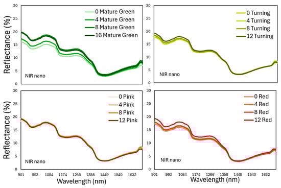 The spectral reflectance that was measured with a portable spectroradiometer (DLP NIR Nano Scan) in the region 900–1700 nm on the tomato fruits that were harvested at four ripening stages and stored at shelf-life conditions for up to 12 days. Each line represents the mean of the 80 fruits in each ripening stage and storage day.