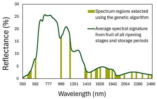 The average spectral reflectance in the visNIR part of the spectrum (340–2500 nm) of the tomato fruits that were harvested at four ripening stages and stored at shelf-life conditions for 12 days (green line). The wavelength regions with the most significant impact on assessing the shelf life period of a fruit, irrespective of ripening stage at harvest, that were detected using the genetic algorithm (GA) are highlighted with a pale green color.