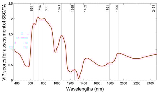 The variable importance in projection (VIP) scores of the spectral reflectance data in the visNIR part of the spectrum (3400–2500 nm) of the tomato fruits with the most significant impact on assessing the SSC/TA, irrespective of ripening stage at harvest or storage duration. The vertical lines correspond to the variables with the most significant effect in the prediction model.