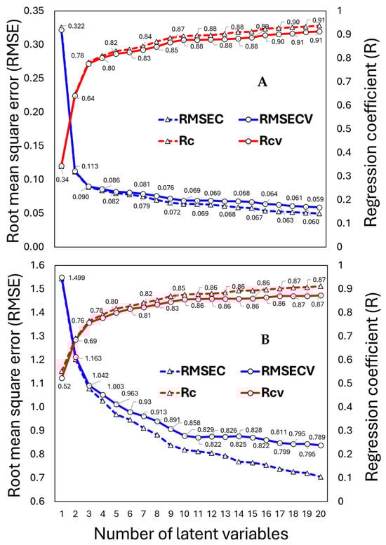 Indeed, it should be noted that the prediction of the shelf-life of tomato fruit was based on PLS regression analysis of visNIR spectroscopic data using only four latent variables (LVs) in the algorithm (Table 3). However, according to Figure 10, it would still be statistically correct to integrate even more of them into the prediction model, and indeed the more the variables, the lower the root mean square error (RMSEcv) and the higher the Rcv. For instance, by using 20 LVs, a significant increase of the regression coefficient (Rcv) from 0.680 to 0.860 and reduction of RMSEcv from 3.76 to 2.51 would have been achieved. We deliberately opted to limit that number to only four LVs though, in order to facilitate the analyses as much as possible and to avoid any risk of increasing the collinearity among the variables that could induce overfitting issues and render our prediction models less reliable. However, if a higher Rc was considered more important, apart from increasing the number of selected LVs in the analyses, another supplementary to SNV preprocessing techniques could had been performed along with the use of an extraction feature method, such as the genetic algorithm that in our case effectively increased Rcv to 0.765 in the visNIR data (Table 3). Similar is the case for the prediction of the nutritional components, as indicated in Figure 11A (for pH) and Figure 11B (for SSC/TA).