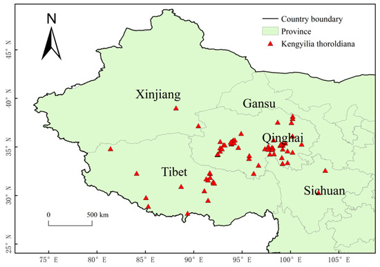 Combined with local flora and literature reports, we obtained 96 points where K. thoroldiana resources were previously reported in the Chinese Virtual Herbarium (https://www.cvh.ac.cn/ accessed on 12 August 2023) and The Global Biodiversity Information Facility database (https://www.gbif.org/zh/ accessed on 15 August 2023). After removing duplicate sample points, we selected 88 distribution points as experimental data (Figure 1).