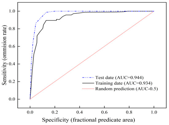 Sensitivity and specificity are used to assess the accuracy of a diagnostic test or detection method. Sensitivity refers to the ability of a diagnostic test to correctly identify a particular environment. Specificity describes the degree to which abnormal results for a diagnostic test are confined to a specific environment. The receiver operating characteristic curve is a composite measure of the continuous variables of response model sensitivity and specificity. Among the 88 geographically distributed coordinates of K. thoroldiana, 66 were randomly selected as training samples, and the remaining 22 were used as test samples. The results showed that the AUC of the model training date was 0.934 ± 0.004, and the AUC of the test date was 0.944 ± 0.043, which were both greater than 0.9, and greater than the AUC of the randomly predicted distribution model. Figure 2 shows the AUC for the test date. This indicated that the potential distribution area predicted by the MaxEnt model had high accuracy, high reliability, and no randomness.
