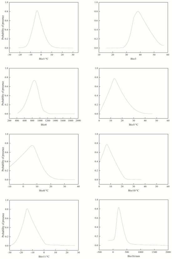 The response curves show how the probability of occurrence varies with each climatic factor. Figure 4 shows the response curves of the above eight climatic factors to K. thoroldiana fitness. With an increase in the climate factor value, there is a rule of a slow increase, rapid increase, rapid decrease, and slow decrease. If the existence probability of K. thoroldiana is greater than 0.62 [25,26], it means that the numerical range of the corresponding environmental factors is conducive to growth. Therefore, the climatic characteristics of K. thoroldiana are: Bio01, −5.8–1.2 °C; Bio3, 35.6–42.3; Bio04, 778–937; Bio05, 11.1–16.2 °C; Bio08, 2.4–9.2 °C; Bio10, 4.5–9.4 °C; Bio11, −16.4–11.9 °C; Bio16, 144–284 mm.