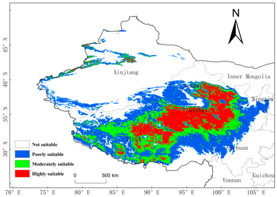 According to the sample analysis, there were no coordinates for Ningxia; thus, in the low-fitness area, K. thoroldiana could not survive easily. Studies have shown that regions with an existence probability above 0.33 have a high probability of species existence and facilitate easy species growth [28,29]. This confirms the reliability and necessity of dividing the suitable zones in this study. Therefore, the core suitable areas of K. thoroldiana are mainly high and moderate areas, and the prediction results show that they are mainly distributed in western, central, southern, and southeastern Qinghai; southwest and southeastern Gansu; central and eastern Tibet; and northwest Sichuan.