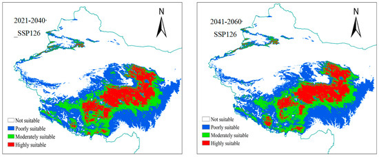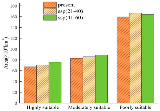 As shown in Table 3, the suitable areas increased slightly, the highly and moderately suitable areas increased continuously, and the poorly suitable areas increased slightly from 2041 to 2060. Thus, all areas increased under the current climate. Under the SSP126 scenario, the highly suitable areas of K. thoroldiana from 2021 to 2040 will be approximately 70.37 × 104 km2, an increase of 4.72% over the current climate scenario. Moderately and poorly suitable areas will increase by 3.60 and 4.40%, respectively. From 2041 to 2060, the highly suitable area will be approximately 75.74 × 104 km2, an increase of 12.71% over the current climate scenario, and the area of moderately and poorly suitable areas will increase by 7.66 and 2.83%, respectively (Figure 5 and Figure 7).