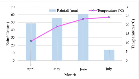 At the time of sowing in April, according to the Croatian Meteorological and Hydrological Service [46], according to the distribution of percentiles, the temperature conditions in Osijek for April were described as cold (Figure 1), but the industrial hemp germination was satisfied. During May, there were no major deviations in temperature and precipitation. June 2022 was extremely warm throughout Croatia, and for the Osijek area, the average temperature in June was 3.2 °C lower than the long-term mean, while the amount of precipitation was average. The average air temperature in July 2022 was 1.8 °C higher as compared to the long term mean 1981–2010 for the Osijek area, with a lack of precipitation. Such weather conditions during the summer months have an unfavorable effect on the growth of industrial hemp, and the plant relatively quickly went into the flowering stage (generative stage).